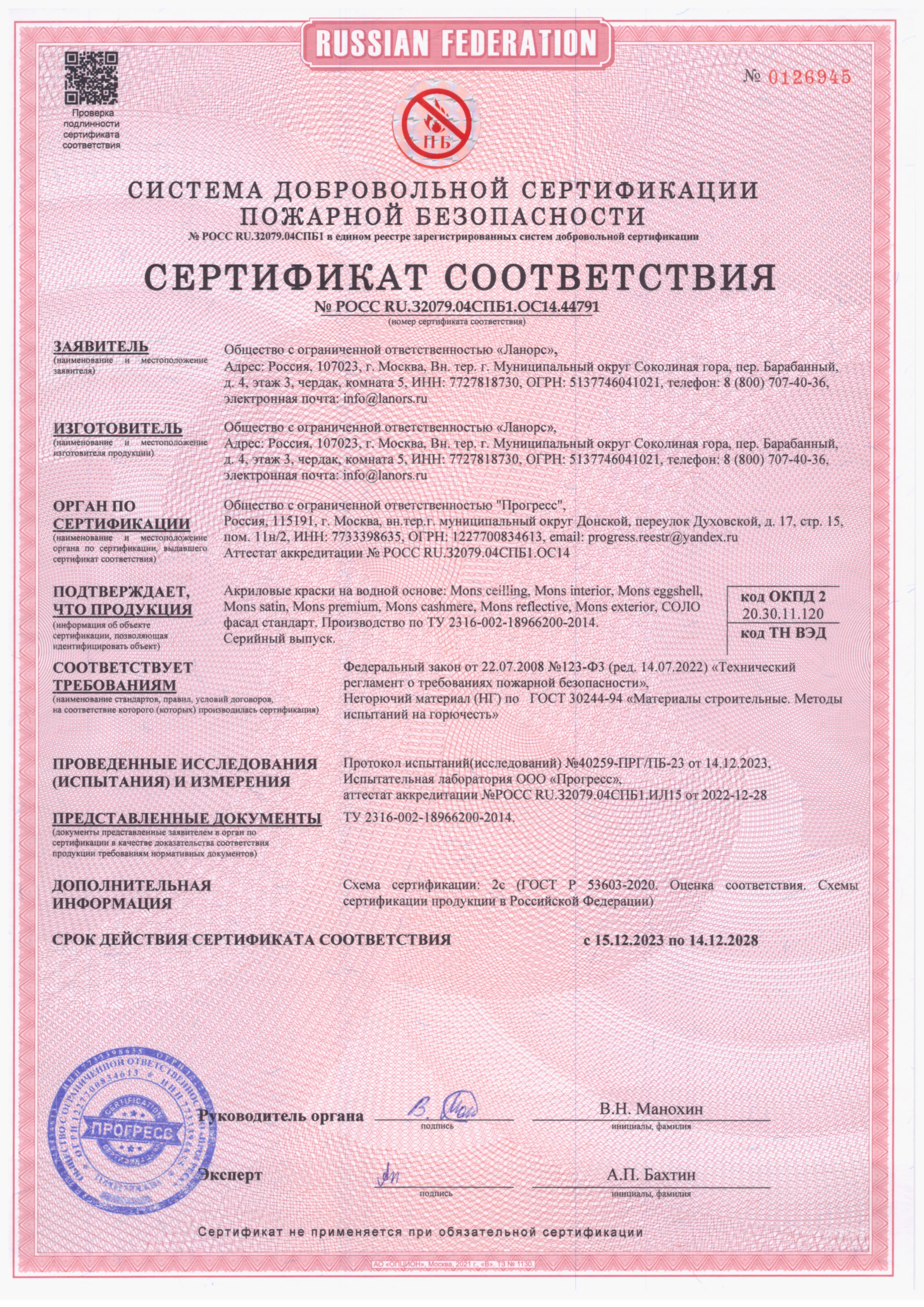 Сертификаты соответствия пожарной безопасности